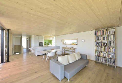 Die Vorgabe des Bebauungsplanes legte eine Erdgeschosshöhe von max. 30 cm über Straßenniveau fest. Bei dieser Ausführung wäre das Erdgeschoss auf der Südseite komplett in den Hang gegraben. Gelöst wurde dieses Problem mit einer Holzkiste als Obergeschoss auf einem erdgeschossigen Betonkern. Der komplette Wohnbereich mit Garten liegt somit im oberen Geschoss mit freiem Blick in die Natur. In dieser Etage ist die komplette Wohnfläche mit 116 m² untergebracht. Im Erdgeschoss befindet sich der Eingangsbereich mit Garderobe, ein kleines Büro und der Technikraum auf 24 m².